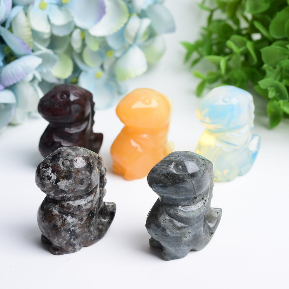 This collection features Mixed Crystals including Opalite, Orange Calcite, Garnet, Labradorite, and Yooperlite. Each dinosaur carving showcases the unique energy and natural beauty of these stones.