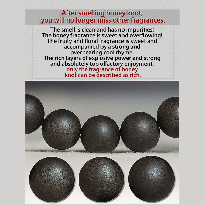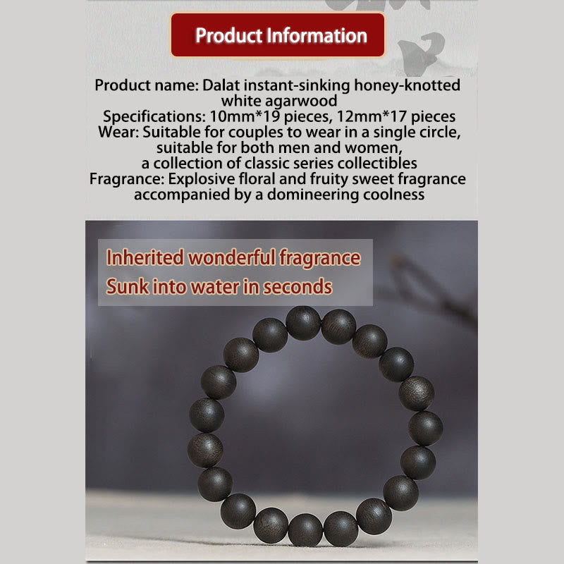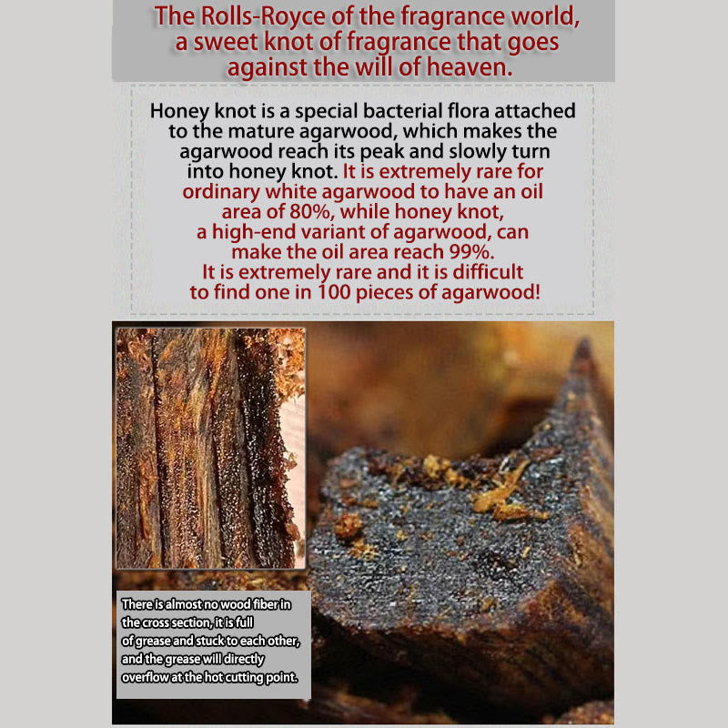Ce qui rend ce bois d'agar si exceptionnel, c'est sa formation en « noeuds de miel », où la teneur en huile atteint un étonnant 99 %, ne laissant pratiquement aucune fibre de bois visible en coupe transversale. Cette caractéristique remarquable se retrouve dans moins de 2 % du bois d'agar récolté, faisant de votre bracelet non seulement un bijou, mais un trésor naturel rare.