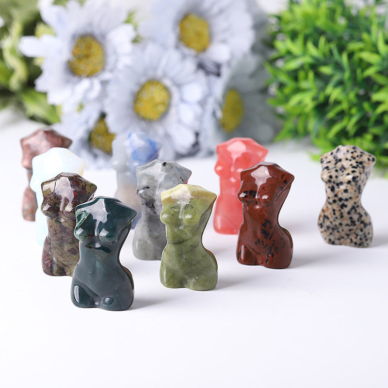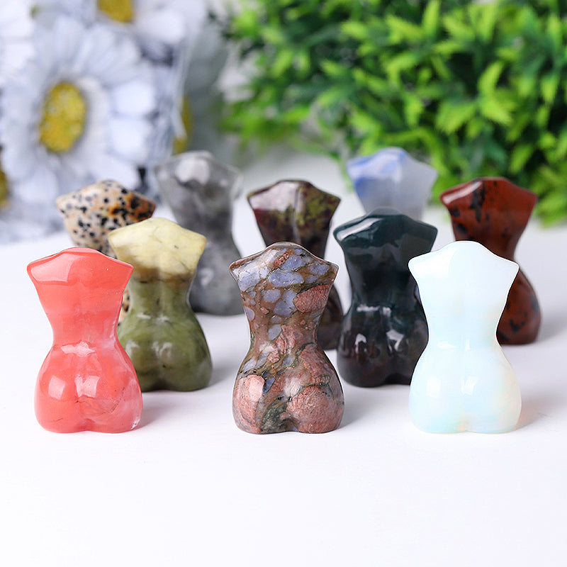 Mesurant environ 5,08 cm de haut, ces petits torses de déesses sont parfaits pour les autels, les espaces de méditation ou les étagères. Leur finition polie et brillante met en valeur les motifs et les couleurs naturels propres à chaque variété de cristal.