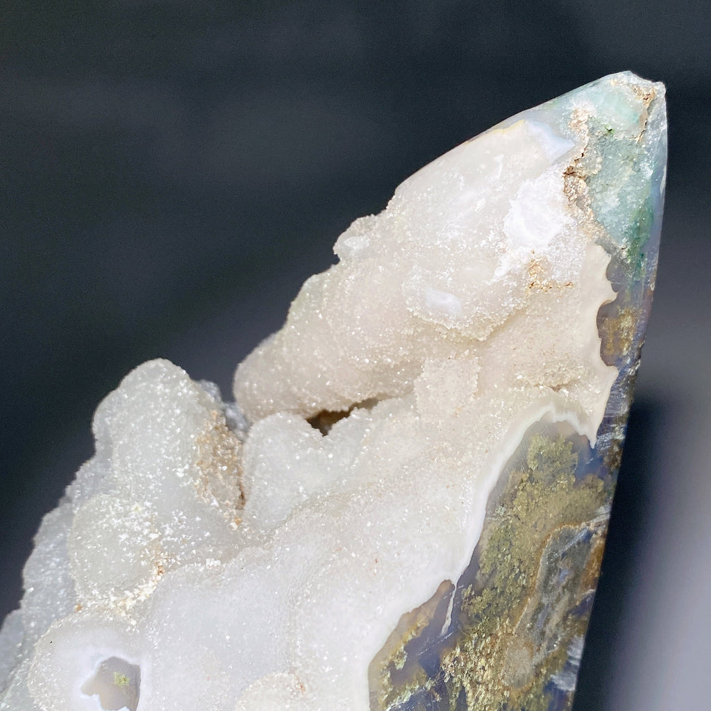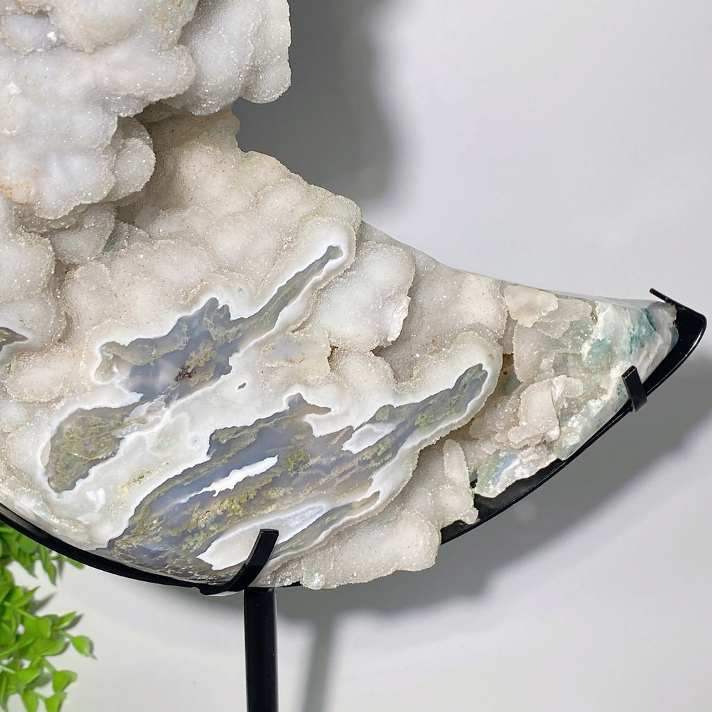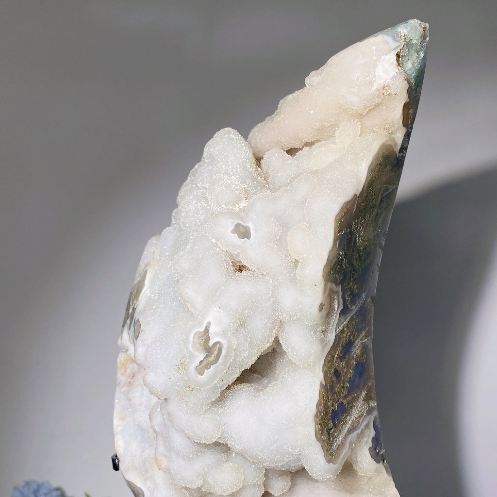 La sculpture lunaire en agate mousse druzy favorise l'équilibre émotionnel et la croissance spirituelle. Connue pour son énergie nourrissante, elle contribue à harmoniser son être intérieur et son environnement, ce qui en fait un outil précieux pour la méditation et les rituels de guérison.