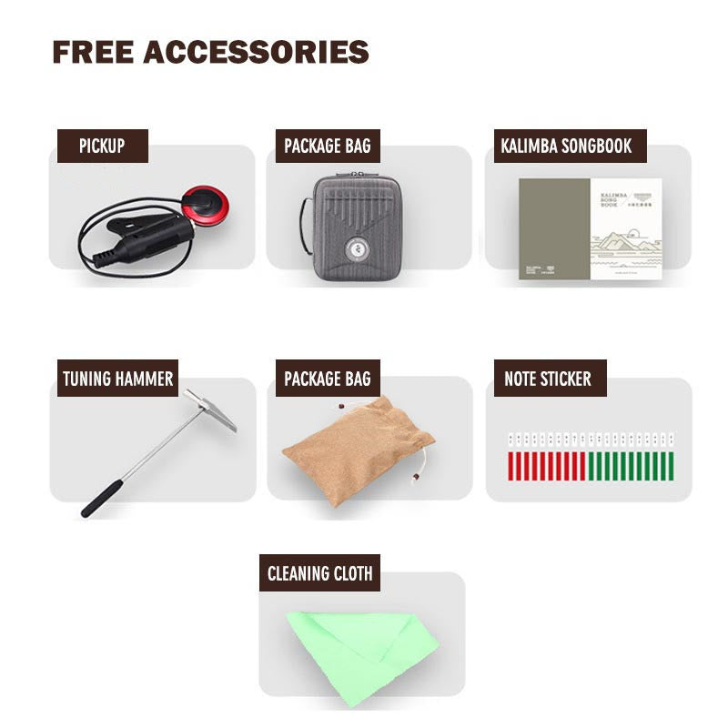 - Le kit complet comprend : un instrument Kalimba, un micro, un sac de protection, un recueil de chansons complet, un marteau d'accordage, des autocollants de notes et un chiffon de nettoyage