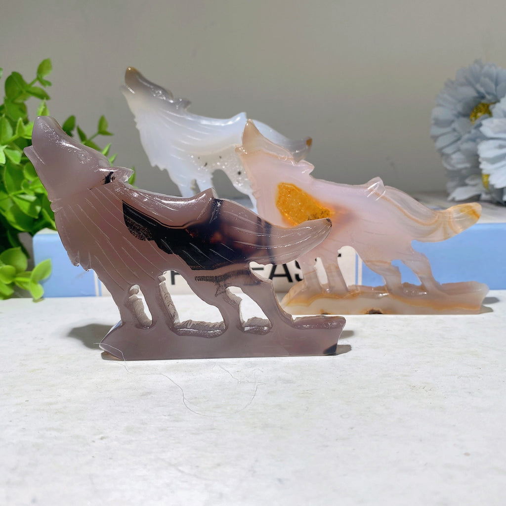 This 4-inch agate wolf carving symbolizes protection and balance. Agate is known for its grounding energy, helping to calm the mind and promote emotional healing.