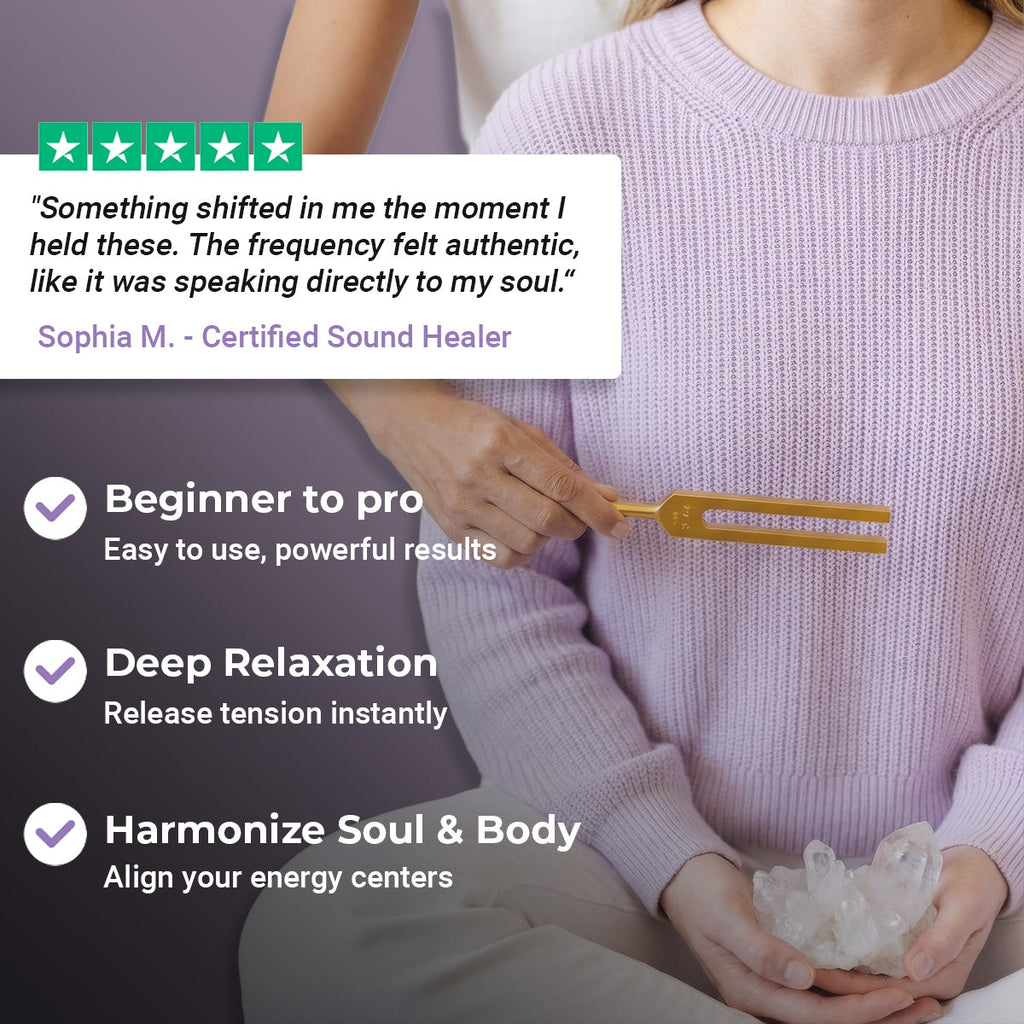 L'ensemble pondéré Solfeggio (9 fourches) combine les 6 tons sacrés originaux (396-852 Hz) avec 3 fréquences supplémentaires (174, 285, 963 Hz) pour des applications de guérison complètes - du soulagement de la douleur à la connexion spirituelle.