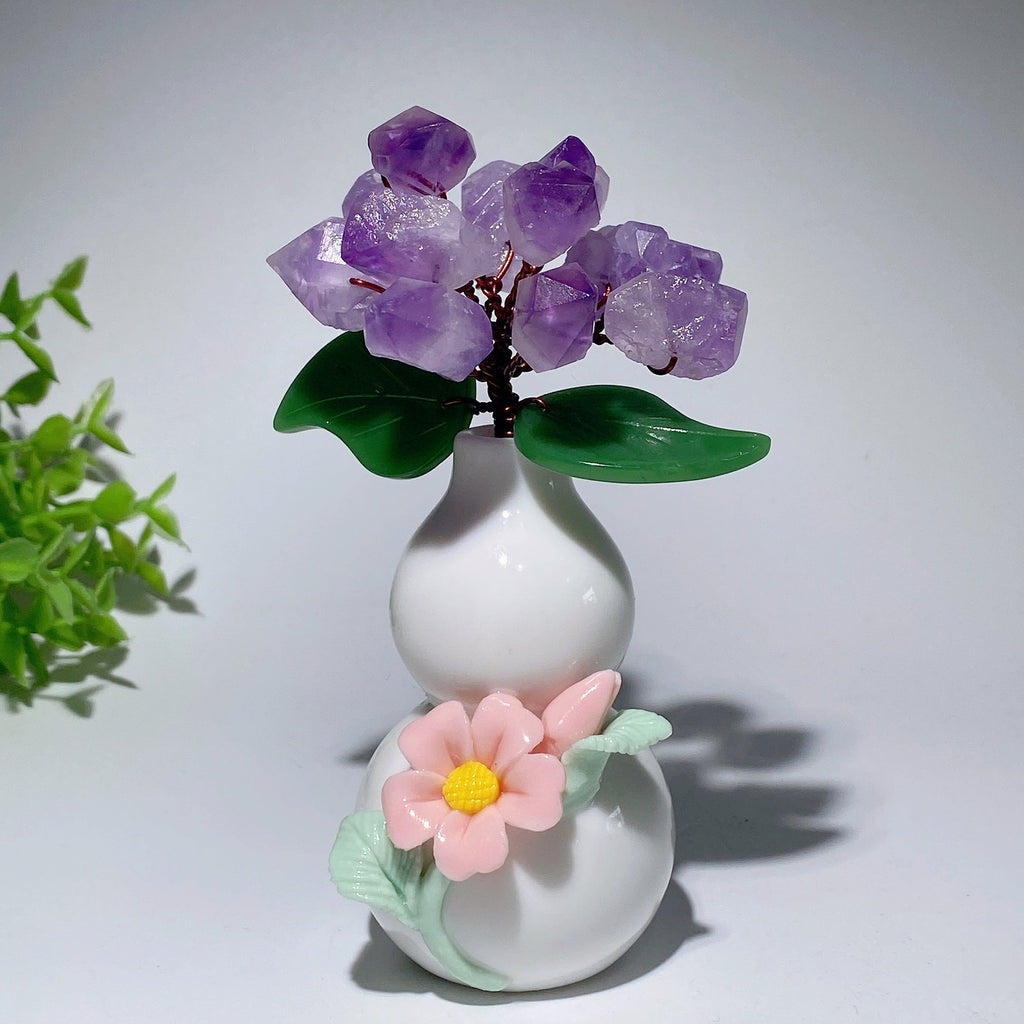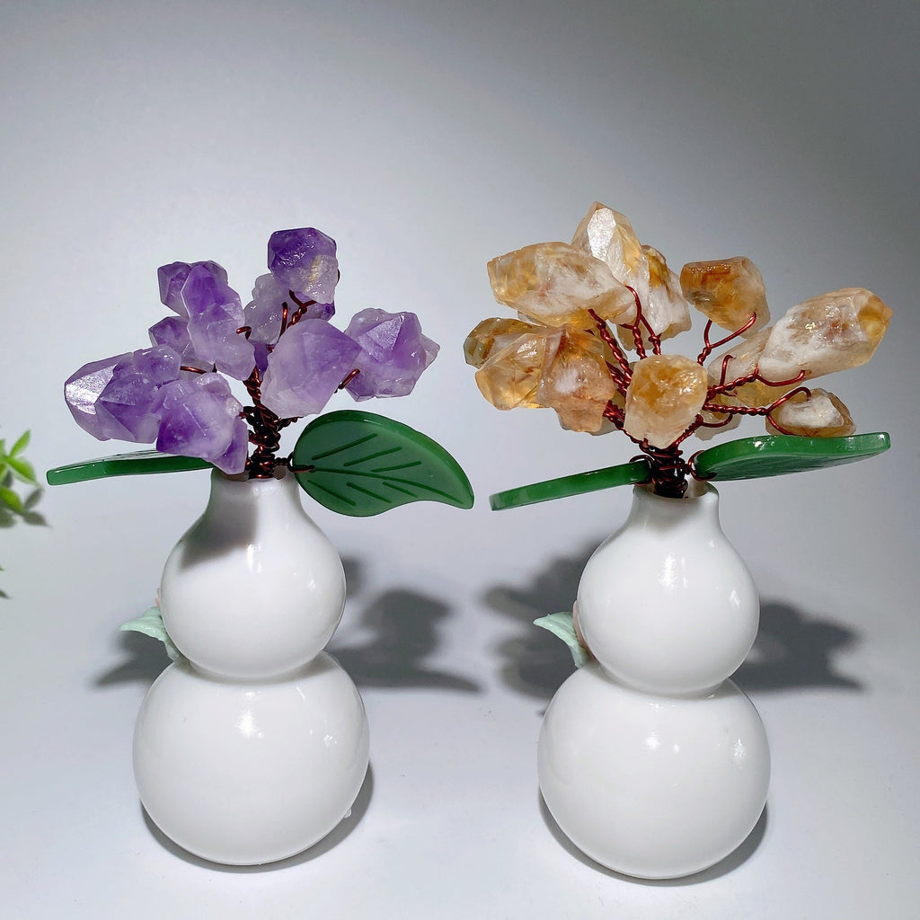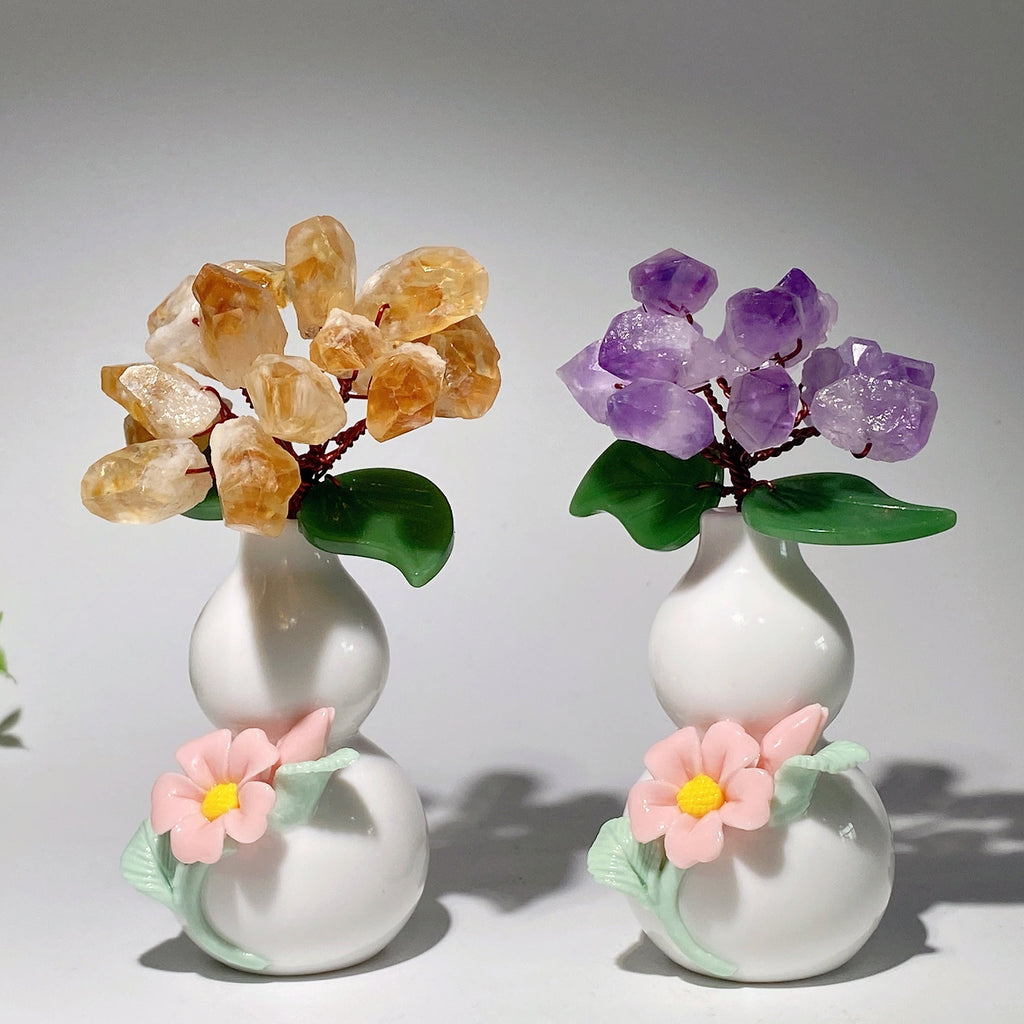 Ce vase en céramique est orné de cristaux d'améthyste et de citrine , reconnus pour leurs bienfaits spirituels. L'améthyste favorise le calme et la clarté, tandis que la citrine favorise la prospérité et l'énergie, ce qui en fait un ajout idéal aux espaces de méditation et de ressourcement.
