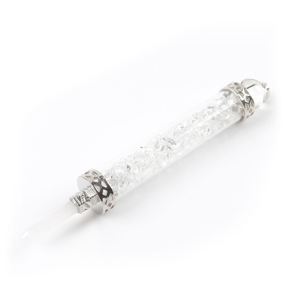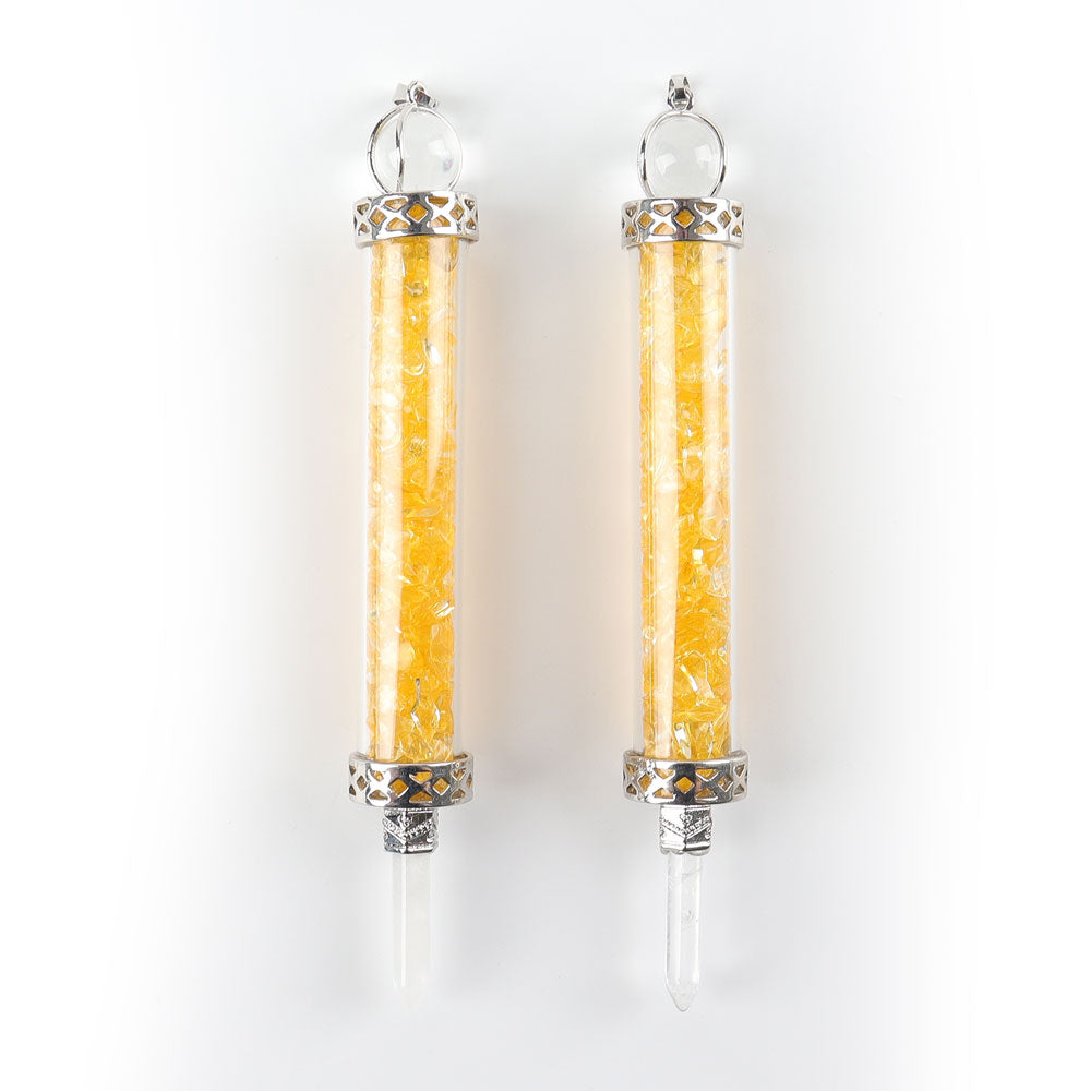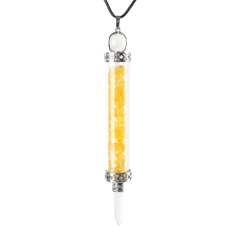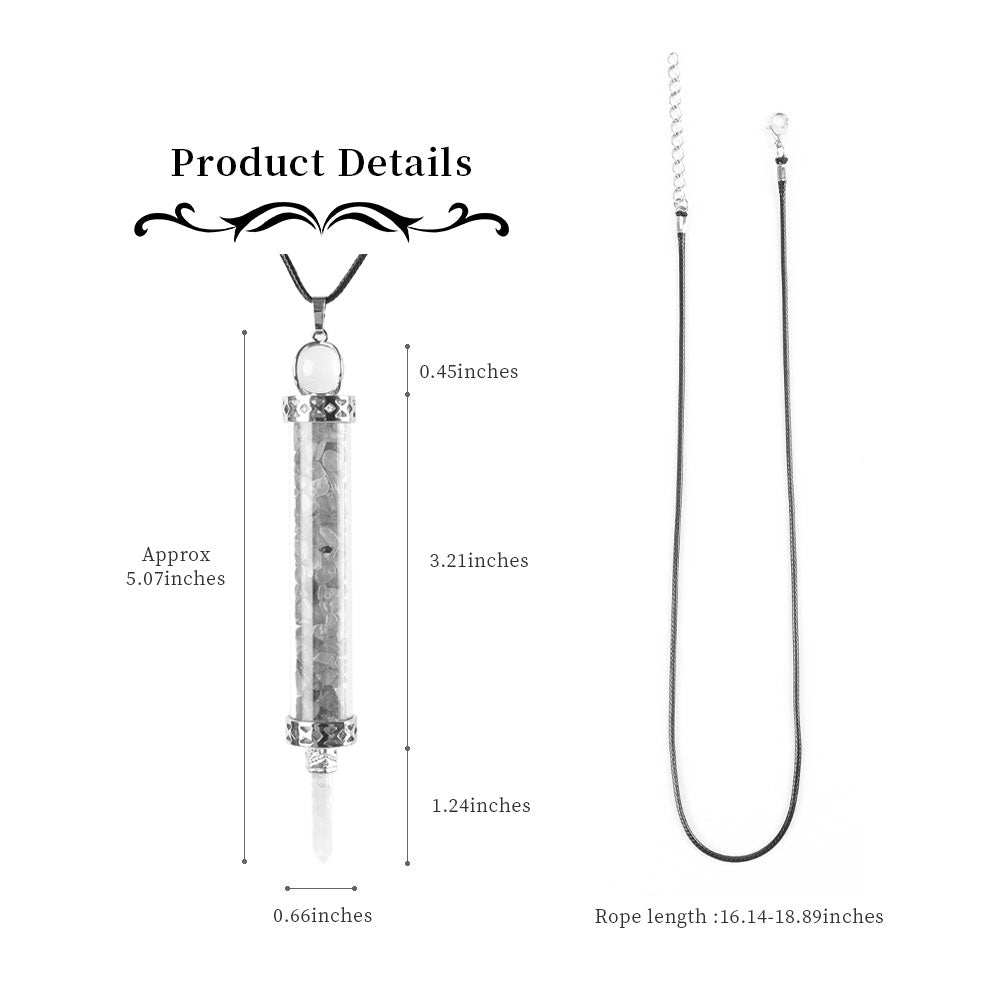 - Pendant type: Glass bottle with gemstone chips and detailed metal caps