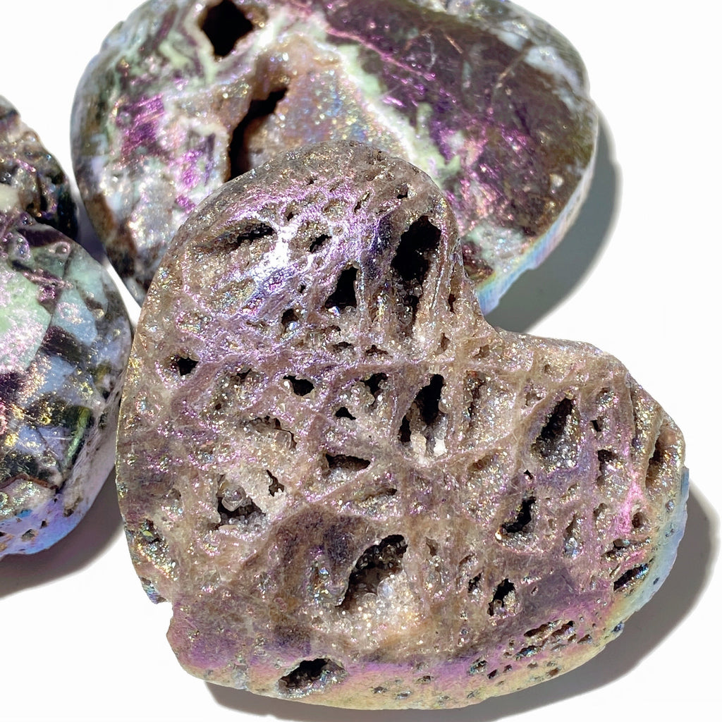 The Aura Druzy Zinc Heart Crystal is cherished for its ability to support emotional healing and enhance feelings of love and compassion. Its shimmering iridescent surface is believed to stimulate the heart chakra, promoting balance and inner peace during meditation or daily wear.