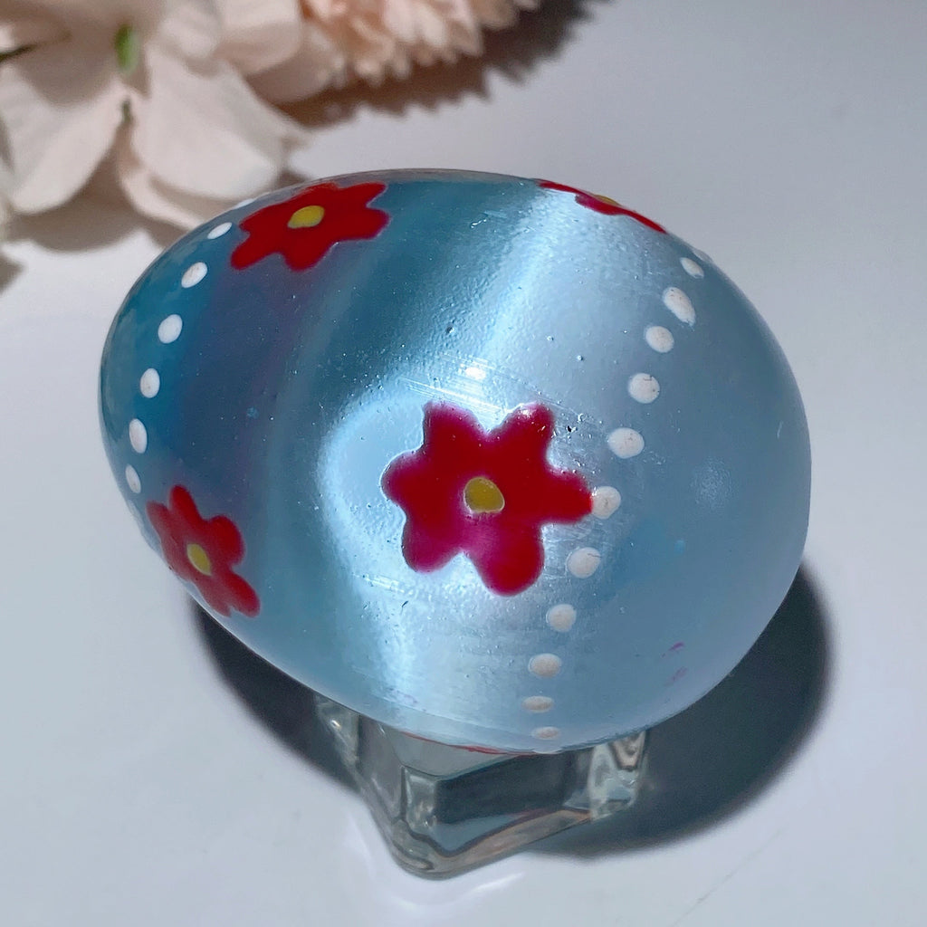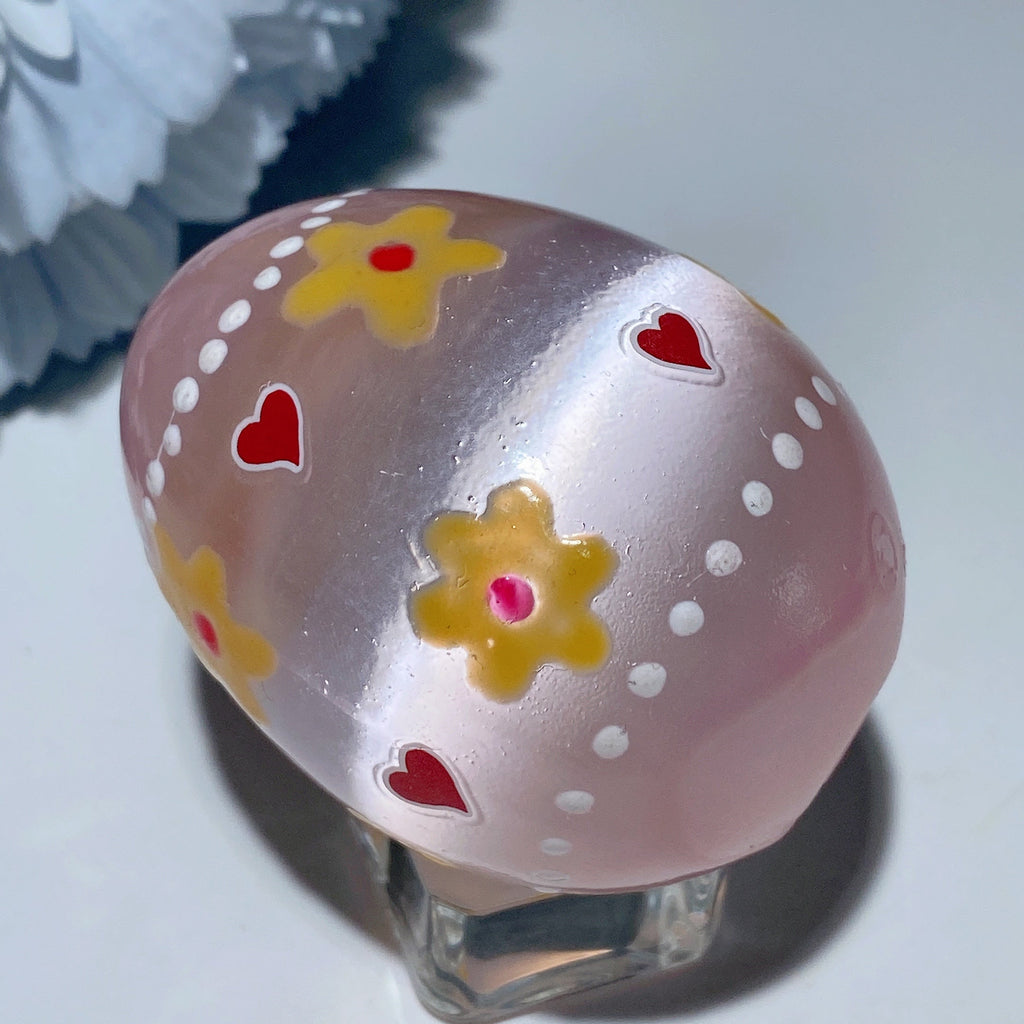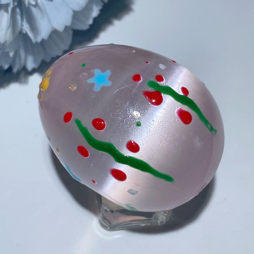 This 60mm Selenite egg is prized for its powerful cleansing energy, promoting spiritual growth and emotional balance. Hand-painted with loving detail, it serves as a beautiful tool for meditation and aura cleansing.