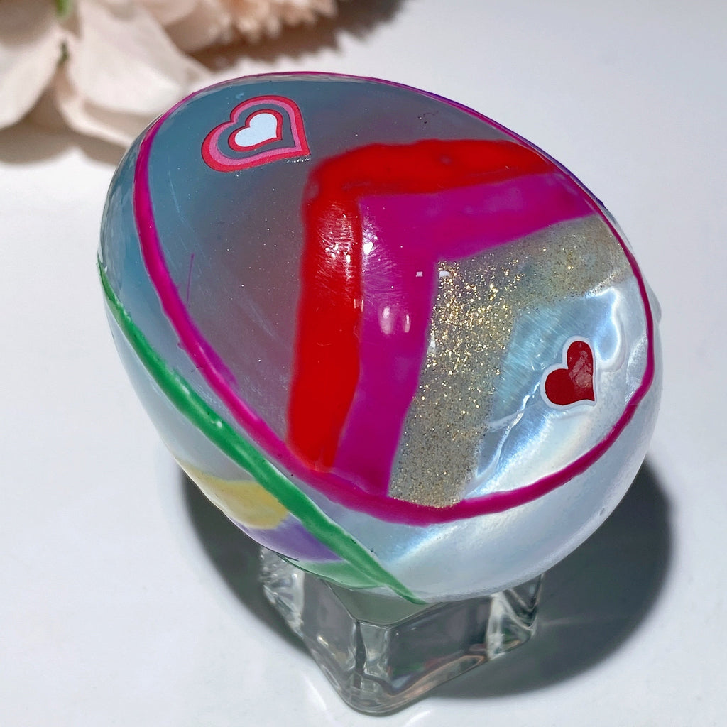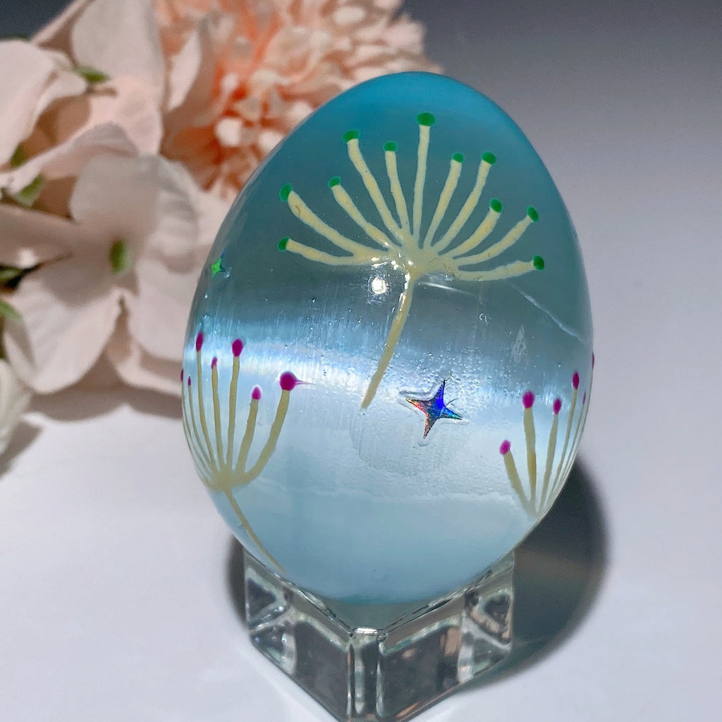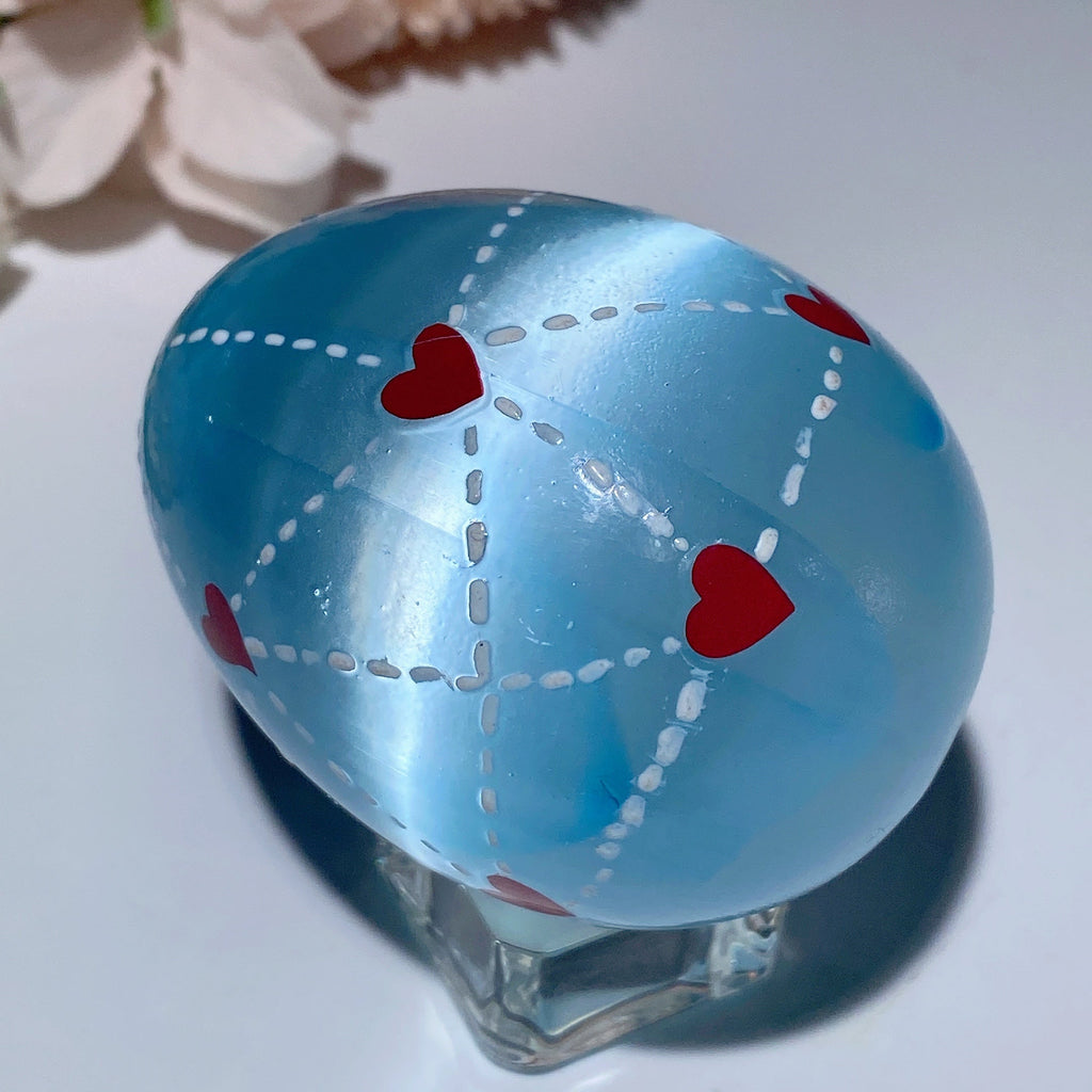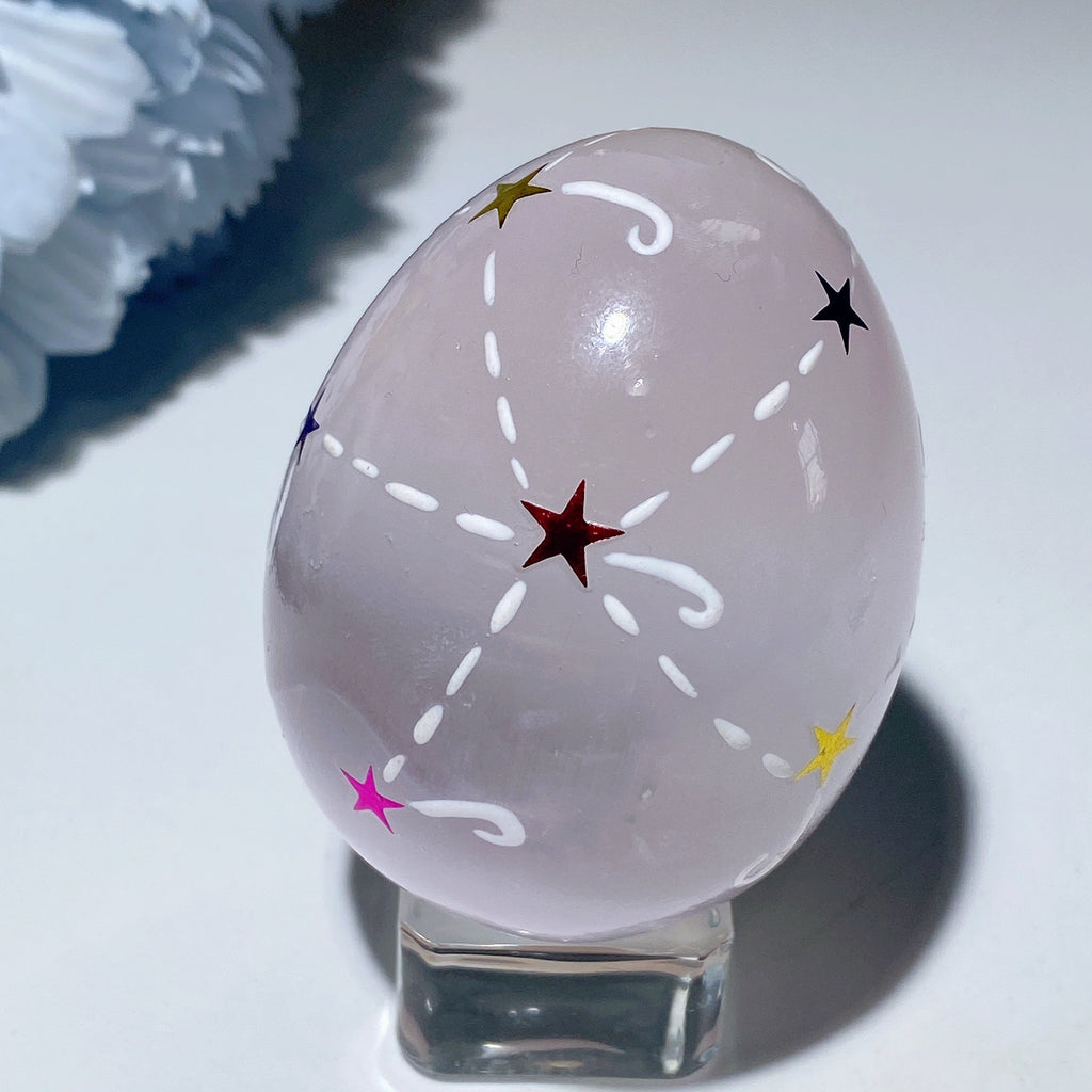 This 60mm Selenite egg is prized for its powerful cleansing energy, promoting spiritual growth and emotional balance. Hand-painted with loving detail, it serves as a beautiful tool for meditation and aura cleansing.