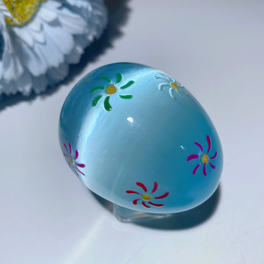 To care for your selenite crystal egg, gently wipe with a soft, dry cloth after use. Avoid water exposure to preserve the stone’s integrity and vibrant hand-painted details.