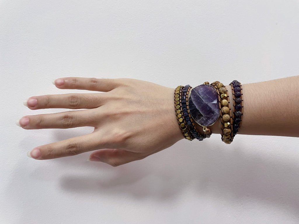 Notre bracelet multi-tours bohème est imprégné de bienfaits curatifs qui vont au-delà de l'esthétique. L'améthyste est connue pour sa capacité à éliminer les blocages dans vos veines, favorisant une meilleure circulation et une meilleure santé globale. L'aventurine verte améliore votre humeur et encourage une attitude positive, tandis que l'œil de tigre aide à réduire les maux de tête et à équilibrer votre esprit et votre corps.