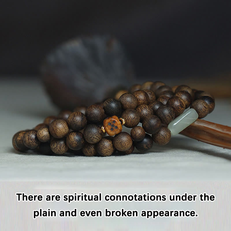 Chaque perle a été soigneusement sélectionnée et disposée pour créer un flux d'énergie harmonieux lors de la pratique du mantra . Les variations naturelles des riches motifs du bois d'agar témoignent de sa croissance dans des conditions difficiles, symbolisant la résilience et l'innovation – des qualités qui se transmettent à celui qui les porte lors des séances de méditation.