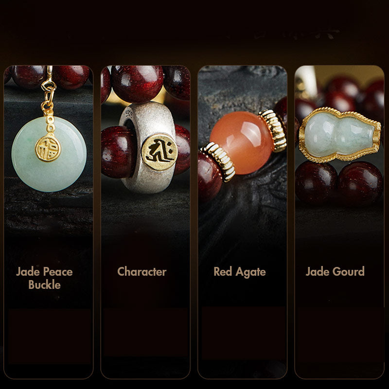 The bracelet is crafted with Small Leaf Red Sandalwood, delicate Jade beads, vibrant Red Agate stones, and high-quality S925 sterling silver with zinc inlays, combining natural beauty with spiritual significance.