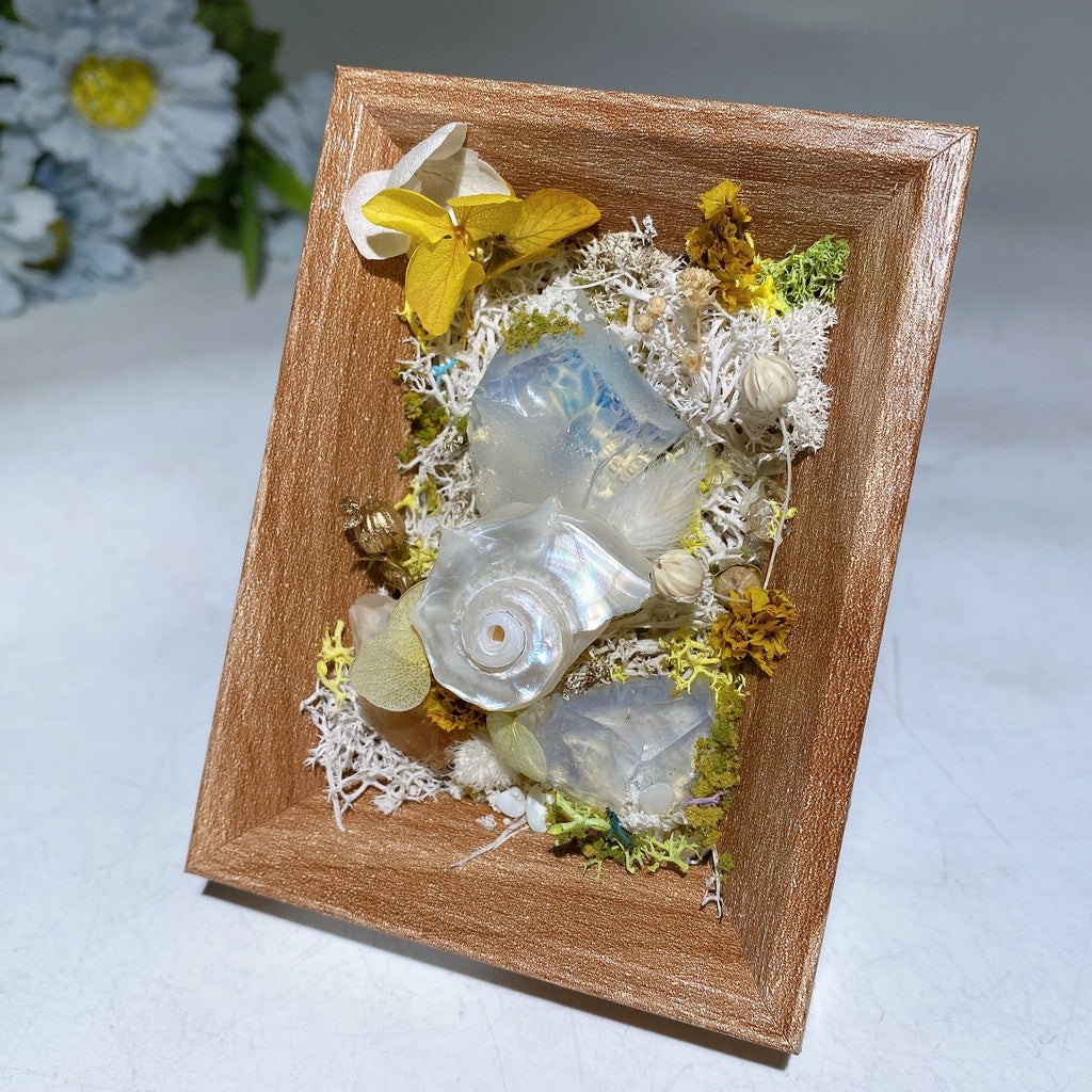 - Material: Wood frame, natural healing crystals, dried flowers, moss