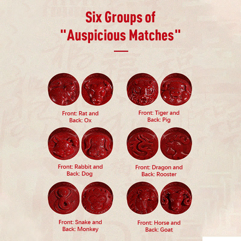 Le concept des « alliances de bon augure » est au cœur de la tradition chinoise du bracelet en cinabre . Il associe des signes du zodiaque qui se renforcent mutuellement : Dragon et Coq, Rat et Bœuf, Tigre et Cochon, Lapin et Chien, Serpent et Singe, Cheval et Chèvre. Ces associations sont censées créer une puissante résonance énergétique capable de transformer divers aspects de votre vie.