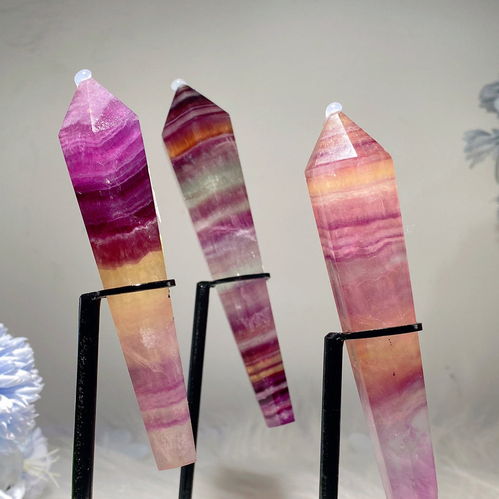 This fluorite crystal wand is known for its ability to balance and cleanse chakras. It enhances energy flow and insight during meditation and healing practices, promoting clarity and calm.