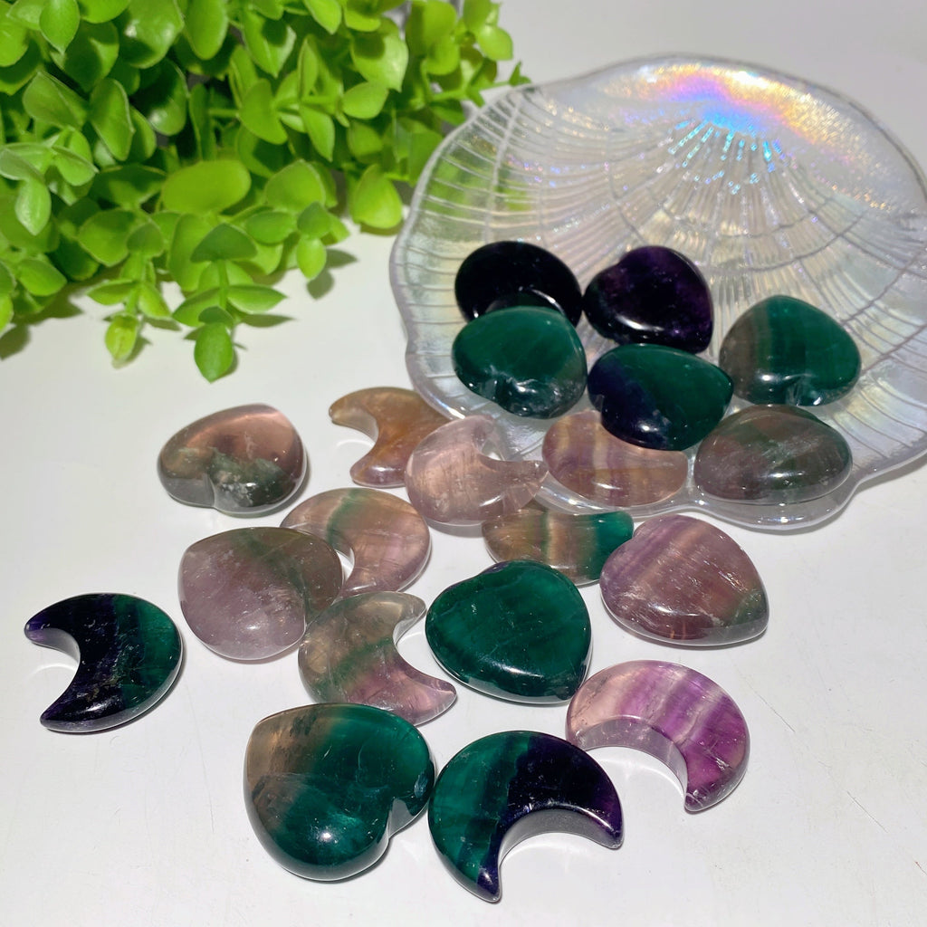 Fluorite is known for its ability to enhance mental clarity and emotional balance. The heart and moon shapes amplify energies of love and intuition, supporting emotional healing and heart chakra alignment.