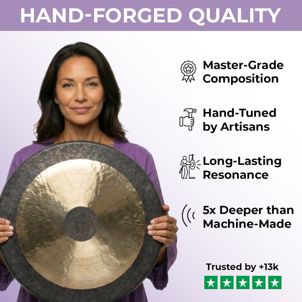 Our Gongs: You are investing in a professional musical instrument, not a decoration. Each gong is hand-forged from premium B20 Bronze (80% copper + 20% tin) or Alloy Nickel Silver to produce the rich, complex harmonics required for genuine sound therapy.