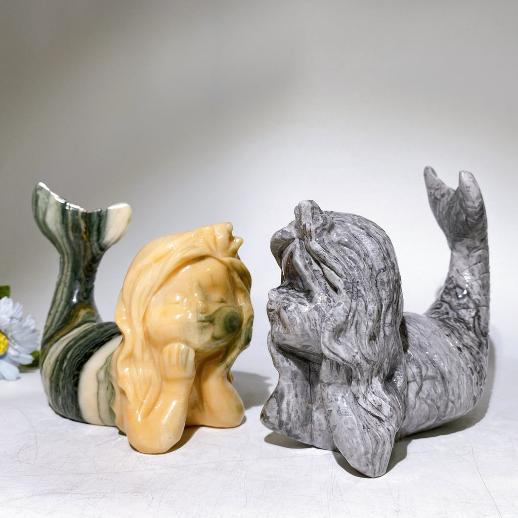 Yes, this mermaid figurine features hand-carved natural stones including jade, serpentine, and picasso stone. Each piece is unique with natural color variations, ensuring authentic crystal animal figurines.