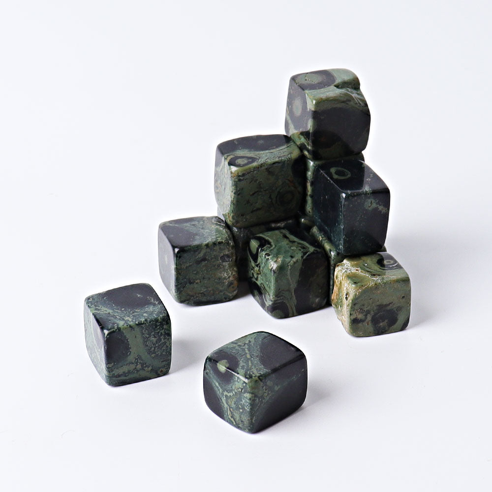 Kambaba Crystal Cubes are polished gemstones known for their calming green and black patterns. They promote tranquility, balance, and deep connection with nature's energies, making them ideal for meditation and energetic healing.