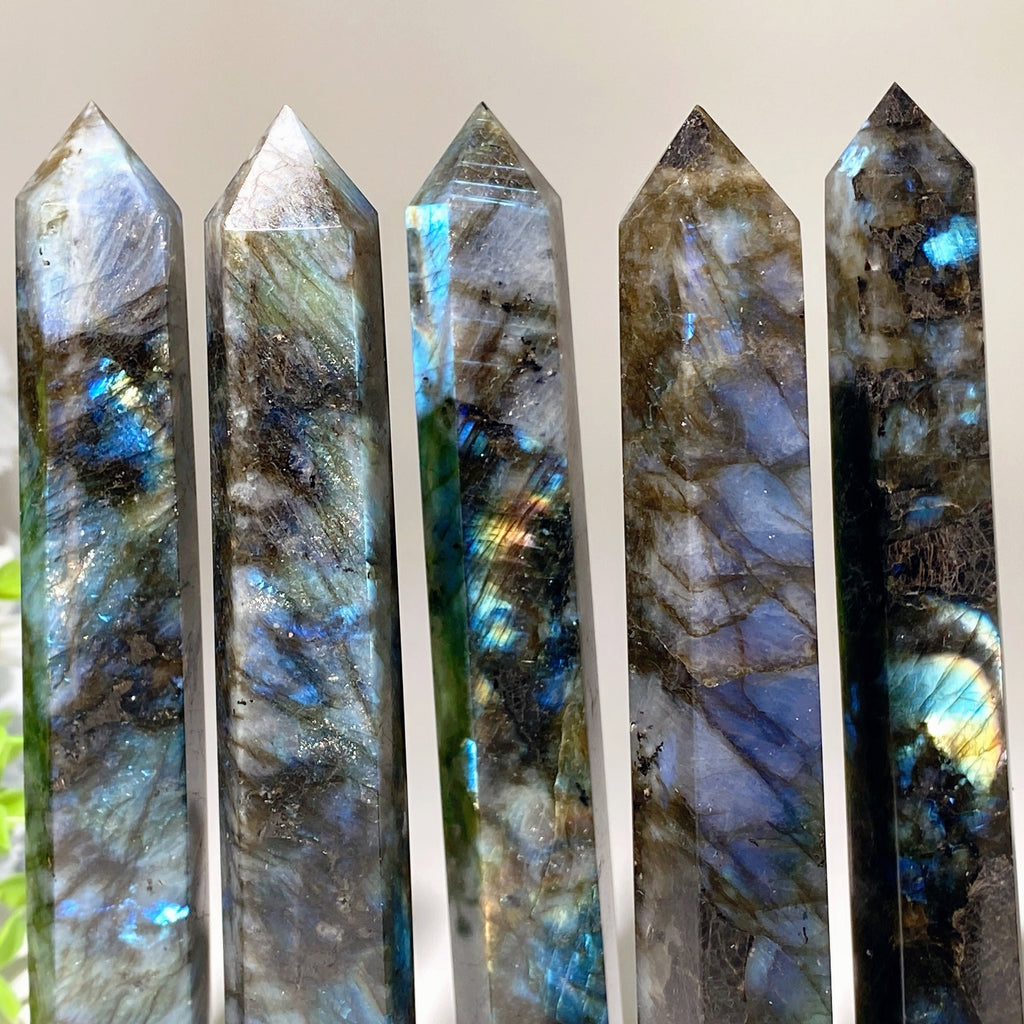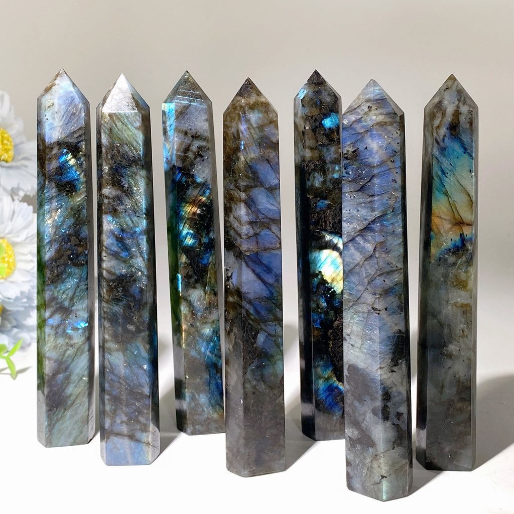 Cette tour de cristal de labradorite mesure environ 16 à 18 cm de haut et pèse entre 170 et 210 g. Sa taille influence la présence et le rayonnement énergétique : une taille plus grande offre un champ énergétique plus fort et plus rayonnant, idéal pour les espaces où l'on recherche une guérison ciblée et un équilibre énergétique.