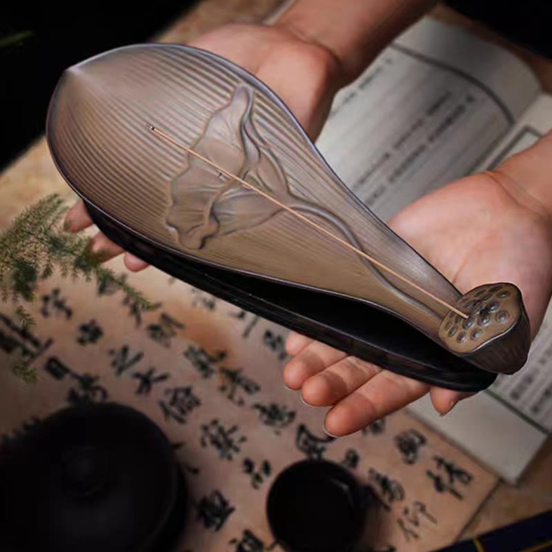 La forme allongée (24 cm) de ce porte-encens en céramique offre un espace généreux pour brûler les bâtonnets d'encens en toute sécurité, les cendres étant soigneusement recueillies dans les alvéoles des capsules de lotus. Cette conception soignée préserve l'intégrité artistique du brûleur et préserve son aspect esthétique.