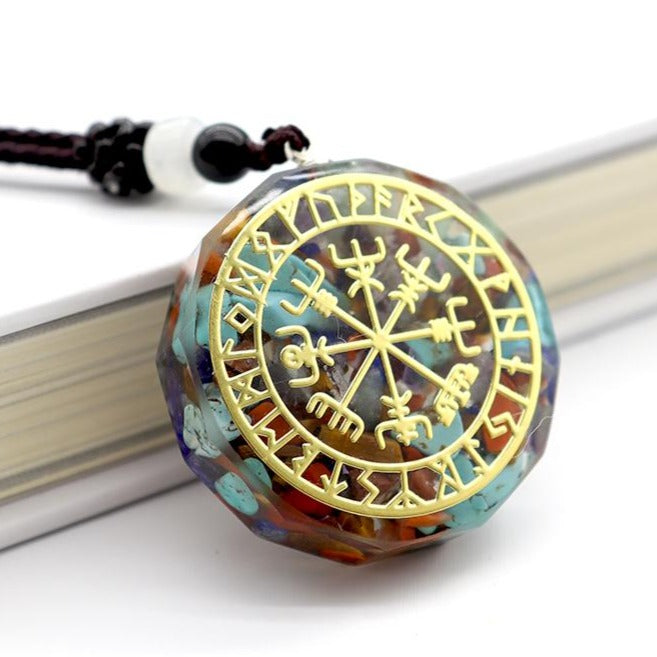 The pendant is crafted from a polished gold-tone metal that encases mixed natural gemstones representing the seven chakras, combining beauty and energy healing.