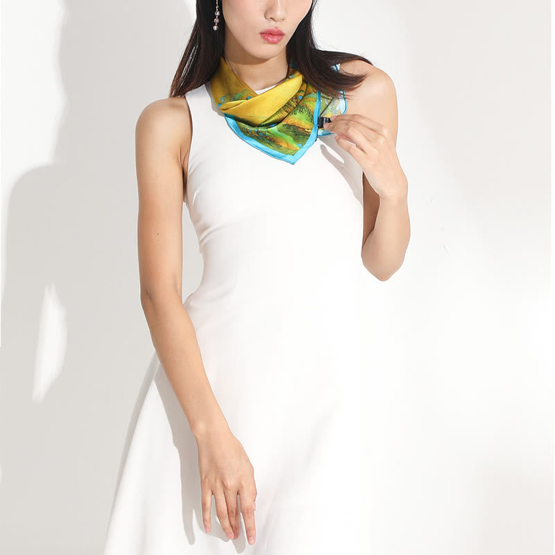 Inspiré du célèbre paysage « Panorama de rivières et de montagnes », ce foulard de méditation capture l'essence même de l'art oriental traditionnel. Les imposantes formations montagneuses et les détails minutieux sont rendus dans un superbe style paysager bleu-vert, où le bleu azurite et le vert malachite dominent la composition, sublimés par de subtiles touches de brun pâle.