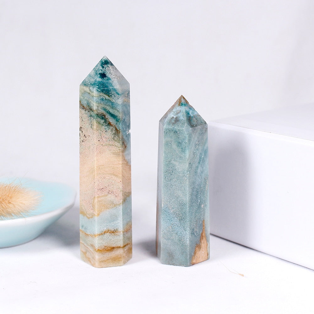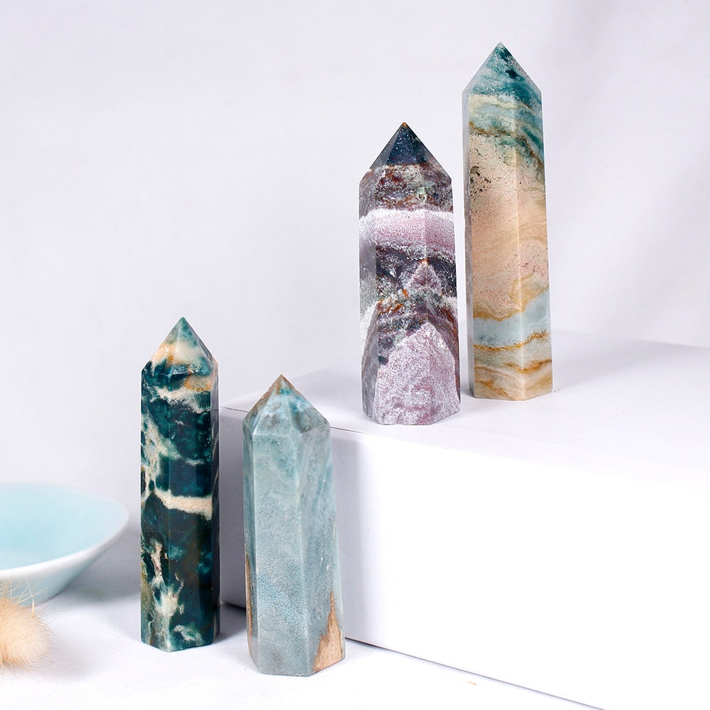 Plongez dans la tranquillité avec notre tour Inspired Healer Ocean Jasper , une création unique conçue pour apporter paix et bonheur dans votre vie. Cette tour de cristal exquise est méticuleusement fabriquée à partir du meilleur jaspe océanique, connu pour ses teintes vibrantes et multicolores et ses remarquables propriétés curatives. En incorporant cette pierre puissante dans votre routine quotidienne, ressentez la libération des émotions et des pensées négatives, ouvrant la voie à la joie et à la positivité. Laissez l'énergie purifiante du jaspe océanique soulager le stress et induire une sensation de calme, rappelant le fait de se tenir au bord de l'océan, vous enveloppant de sentiments de renouveau et de sérénité.
