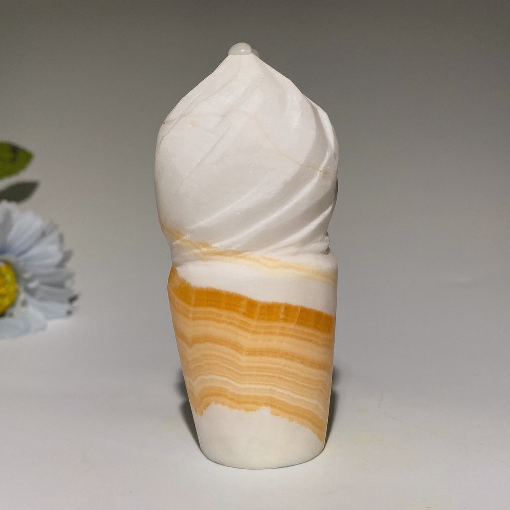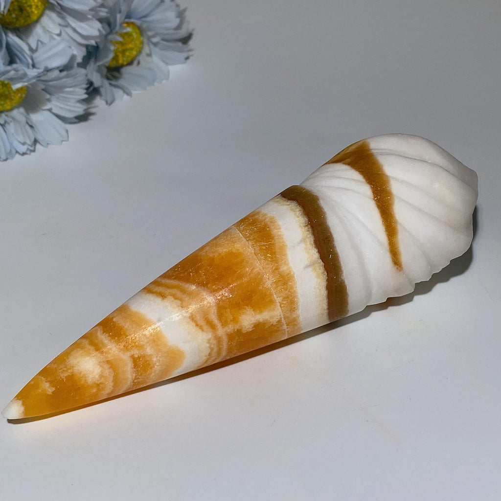 The orange calcite ice cream cone carving enhances creativity, energizes the spirit, and promotes emotional balance. Its warm orange hue uplifts mood and encourages positive energy flow in your space.
