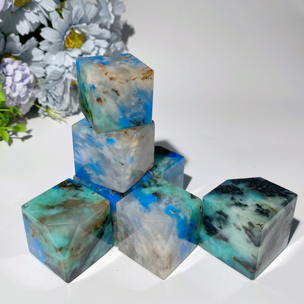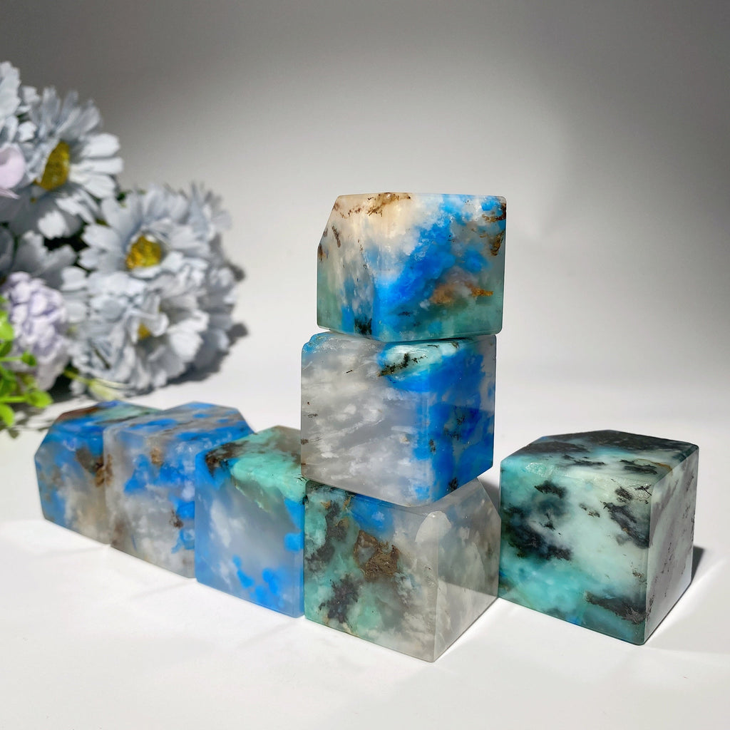 Each of these healing crystal cubes showcases nature's artistry with its captivating blend of teal, blue, white, and brown tones that swirl together in a unique energetic symphony. The polished surfaces catch light beautifully, enhancing the cube's natural translucency and revealing the complex mineral structure within.
