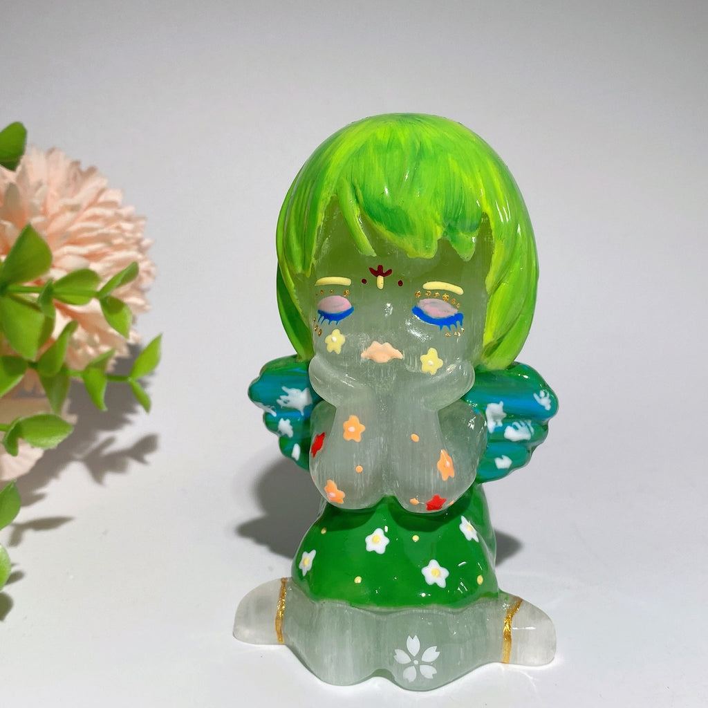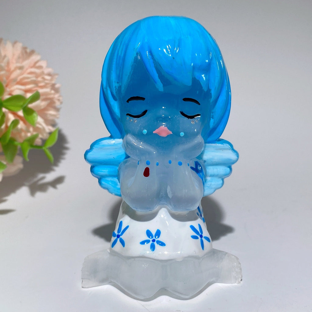 To care for your selenite angel, gently clean it with a soft, dry cloth. Avoid water or harsh chemicals to preserve its delicate structure and natural energies for years of beautiful use.