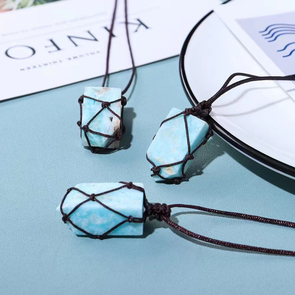Le sertissage soigné en corde noire crée un contraste saisissant avec la pierre d'un bleu lumineux, mettant en valeur ses facettes naturelles et sa forme unique. Chaque pendentif est maintenu par un filet noué à la main, permettant ainsi de le porter confortablement tout au long de la journée. Ce bijou symbolique allie beauté esthétique et soutien énergétique, sans détourner l'attention de ses vertus centrales.