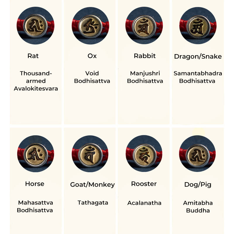 Le Rat est protégé par Avalokitesvara aux mille bras, qui lui apporte compassion et ingéniosité. Les signes du Buffle et du Tigre bénéficient de la force et de la détermination du Bodhisattva du Vide. Les signes du Lapin sont liés à la sagesse du Bodhisattva Manjushri, tandis que les signes du Dragon et du Serpent sont protégés par la clairvoyance du Bodhisattva Samantabhadra. Les signes du Cheval bénéficient de l'énergie du Bodhisattva Mahasattva, les signes de la Chèvre et du Singe bénéficient de la présence apaisante du Tathagata, les signes du Coq sont protégés par la concentration d'Acalanatha, et les signes du Chien et du Cochon sont liés à la compassion du Bouddha Amitabha.