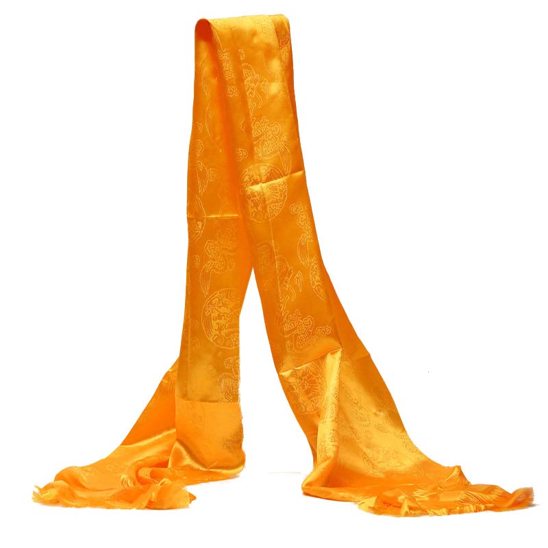 This Khata comes in three sizes: Small (150cm x 24cm / 59in x 9.4in), Medium (160cm x 33cm / 63in x 13in), and Large (230cm x 43cm / 90.5in x 16.9in). Choose based on your space or ceremonial needs.