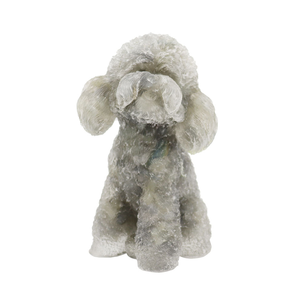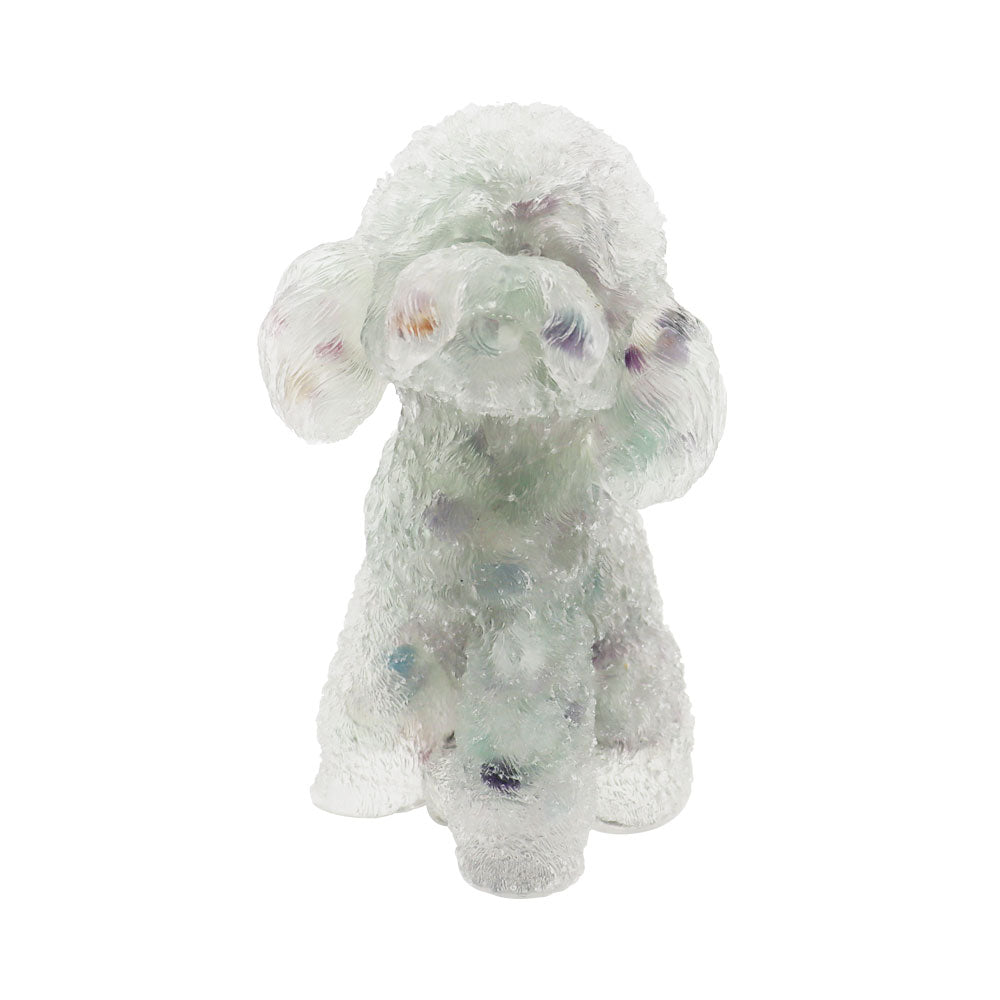 The resin poodle figurine combines the energetic properties of its crystal chips with the loving energy of the poodle form, promoting peace, fortune, and positive energy in your space.