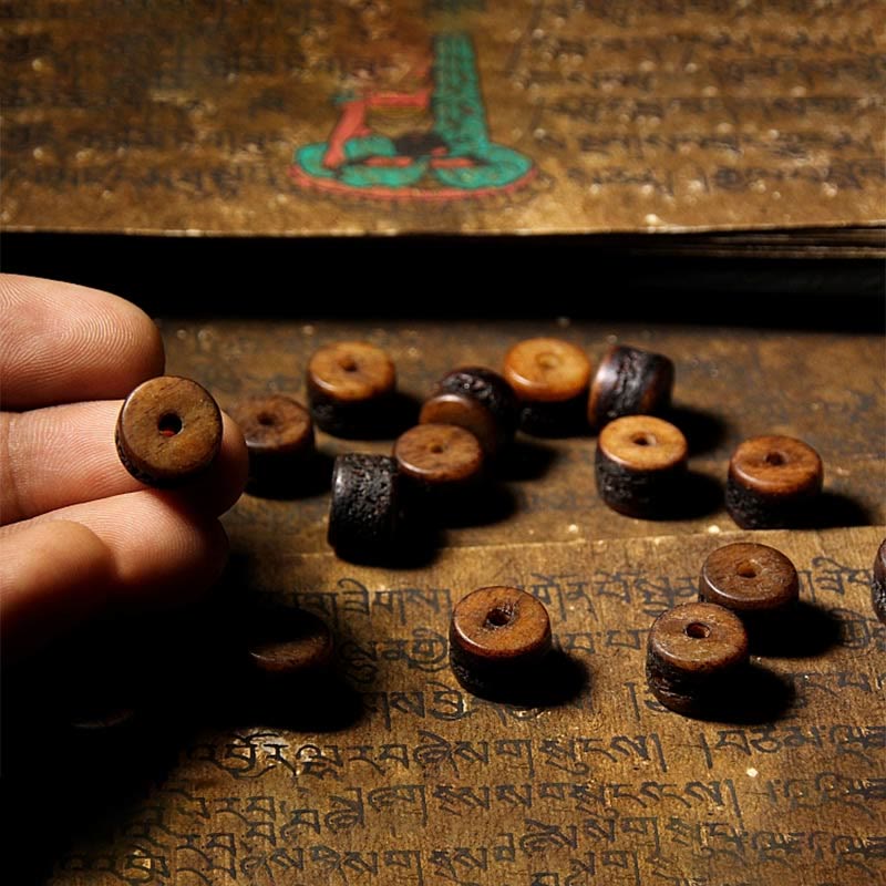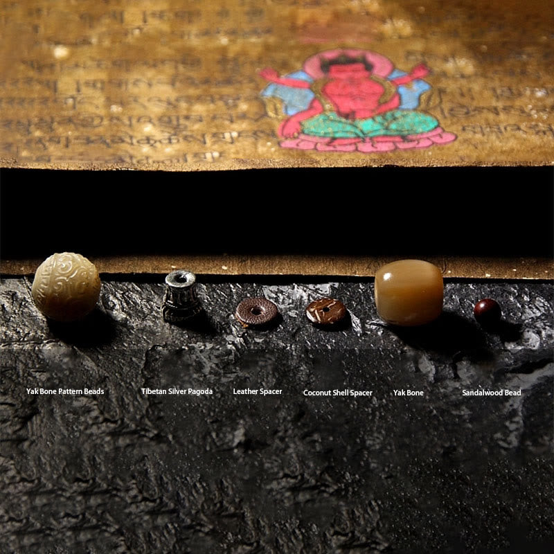 - Matériaux : Os de yak authentique, grès bleu, turquoise véritable, agate perlée Dzi, accents en argent tibétain, éléments en cuir, coquille de noix de coco et perles de bois de santal